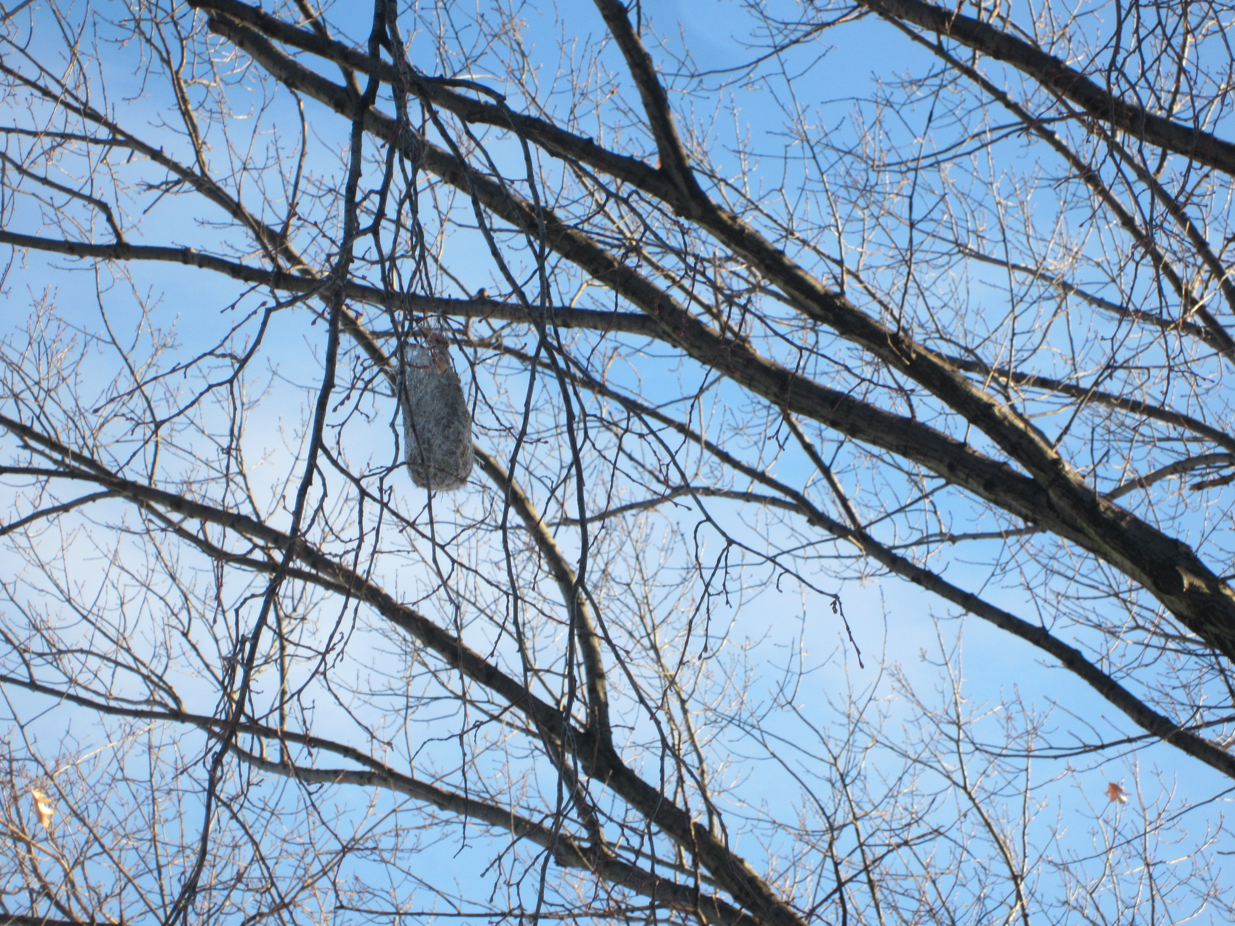 Mary Holbrow identified the oriole nest above, looking much like a crocheted sack, just on the park side of the pedestrian footbridge. She notes that “According to an informative piece on the National Wildlife Federation website, many birds that use string seem to like white string best. Where the nesting bird found this much of it is a puzzle, though. Possibly from fiberglass scraps and monofilament fishing line.”