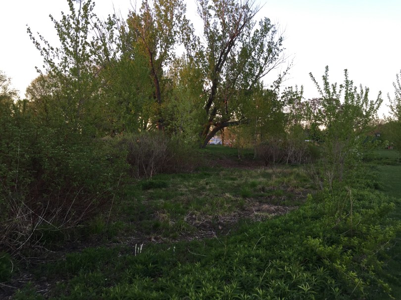 A swale cleared of invasive volunteer trees that were taking it over and crowding out wildflowers
